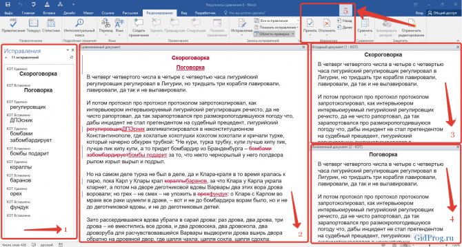 В выделенном квадрате с цифрой «1» появятся все удаленные и вставленные слова. Правее, зона с цифрой «2» Показывает сравниваемый документ с наличием в тексте и удаленные и вставленные на их место слова. Рабочая область с цифрой «3» отображает нам исходный документ (до внесения правок), в то время как пространство с цифрой «4» показывает нам измененный документ с внесенными правками.