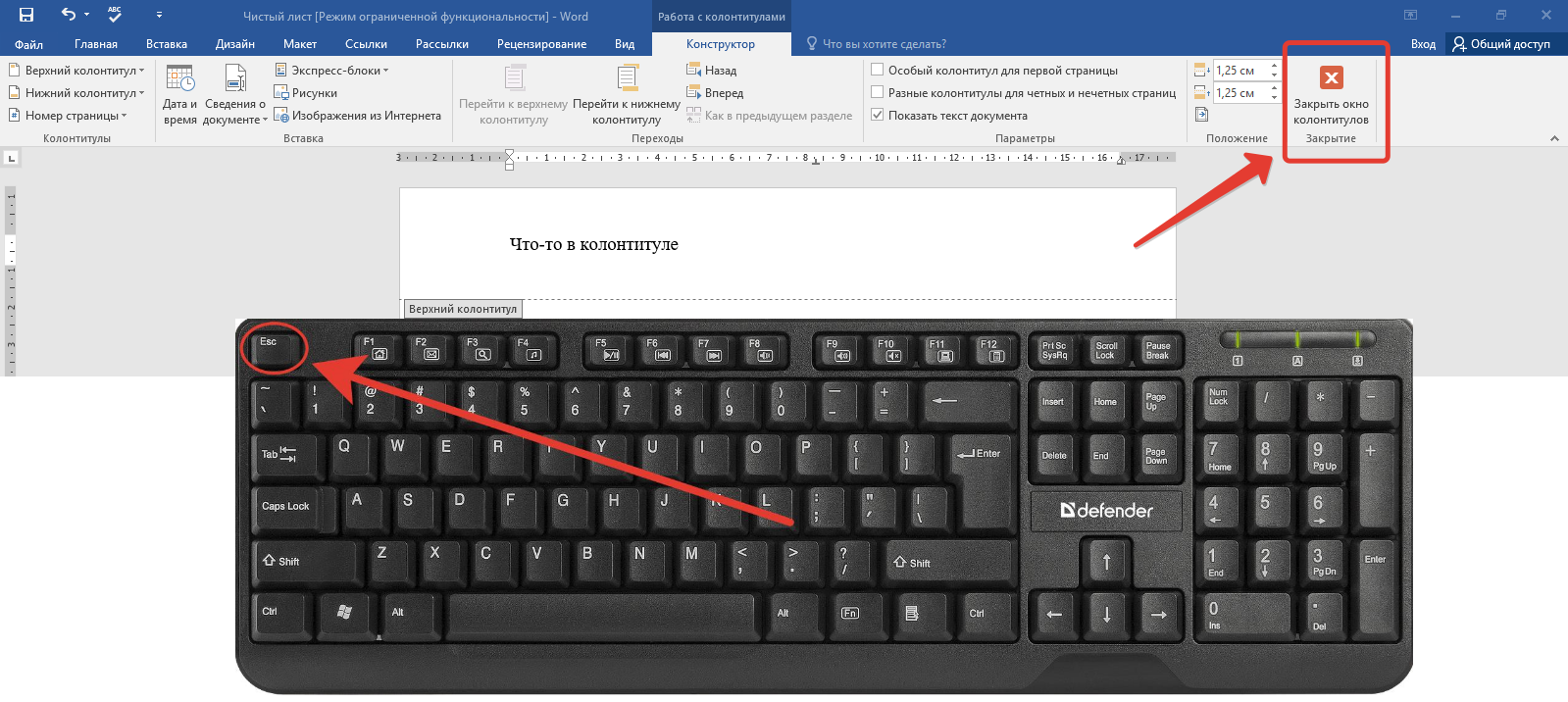 Выйти также не составляет труда. Первый наиболее быстрый способ, это просто нажать на клавиатуре Esc. А второй, нажать на панели инструментов «Закрыть окно колонтитулов».